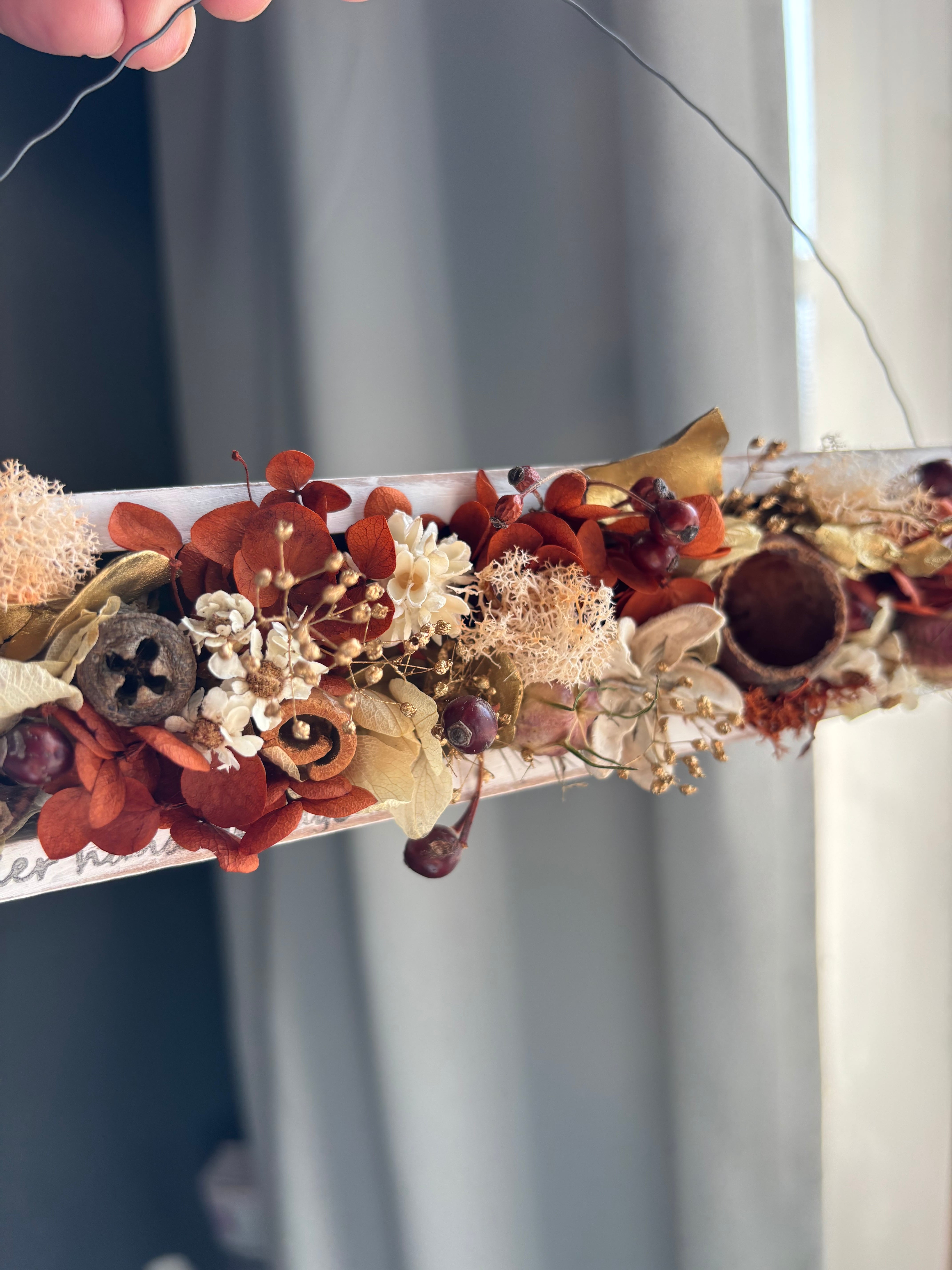 木箱オーナメントアンティークブラウンは、紫陽花や木の実を使った温かみのあるデザインです。