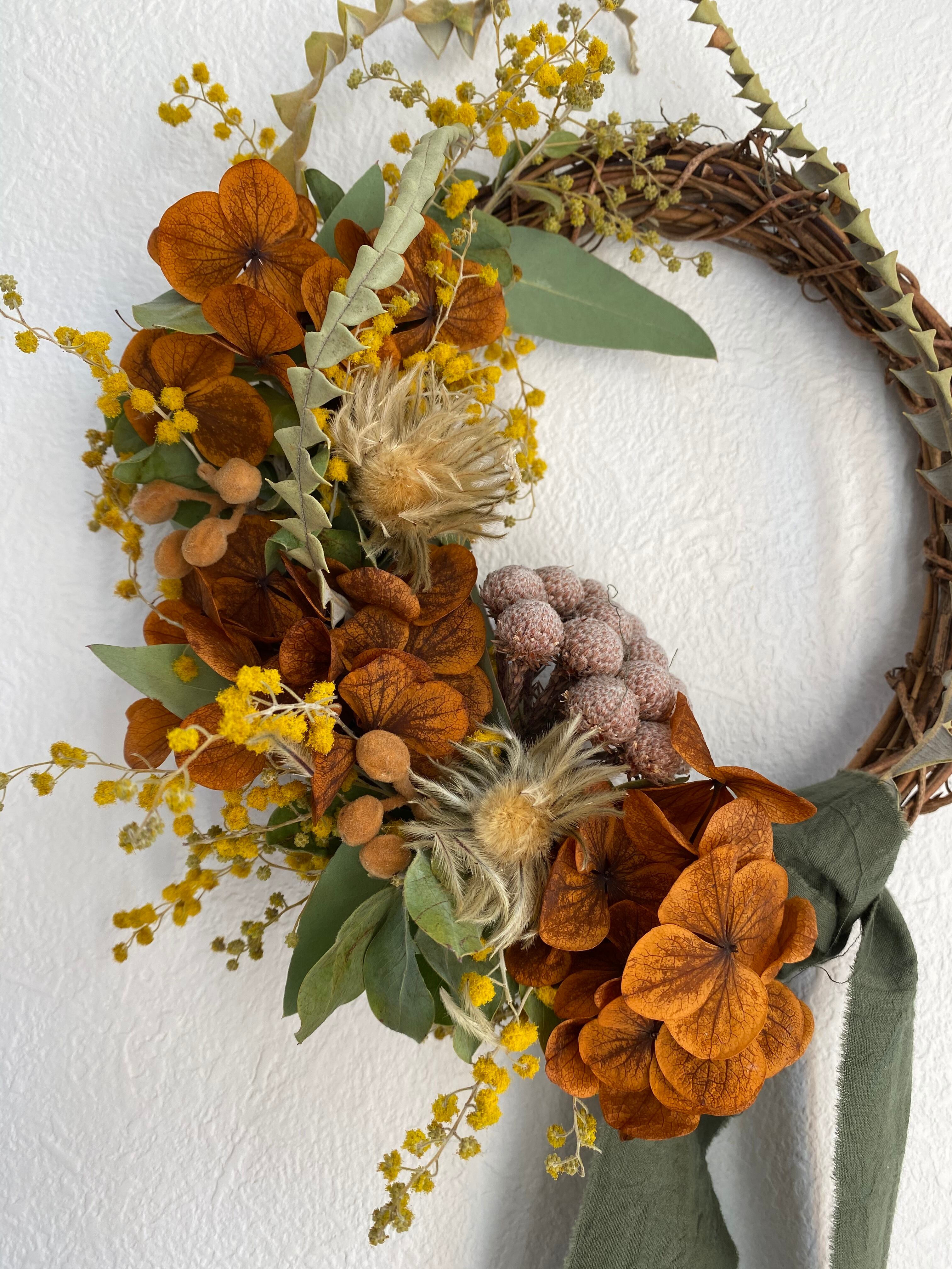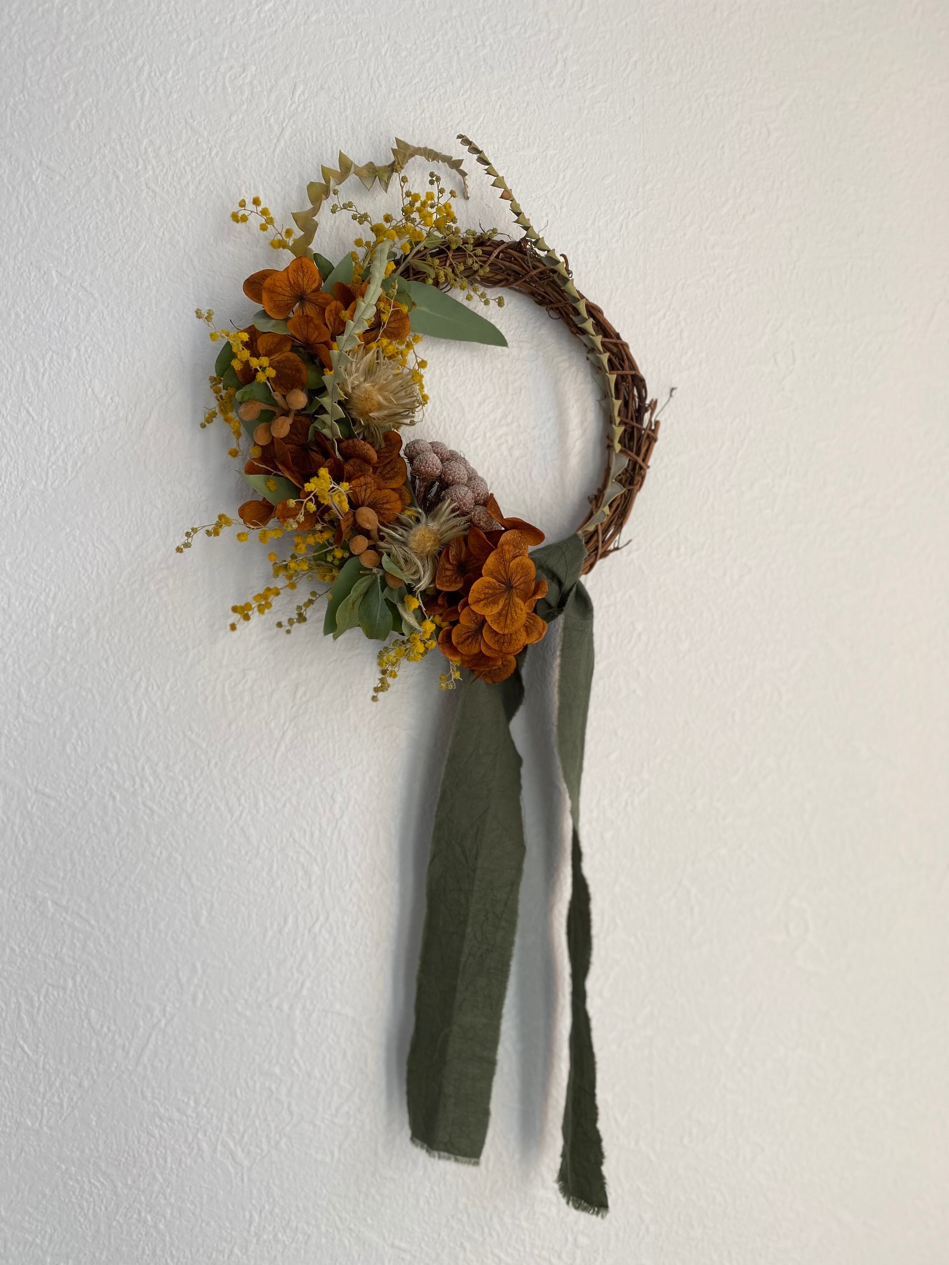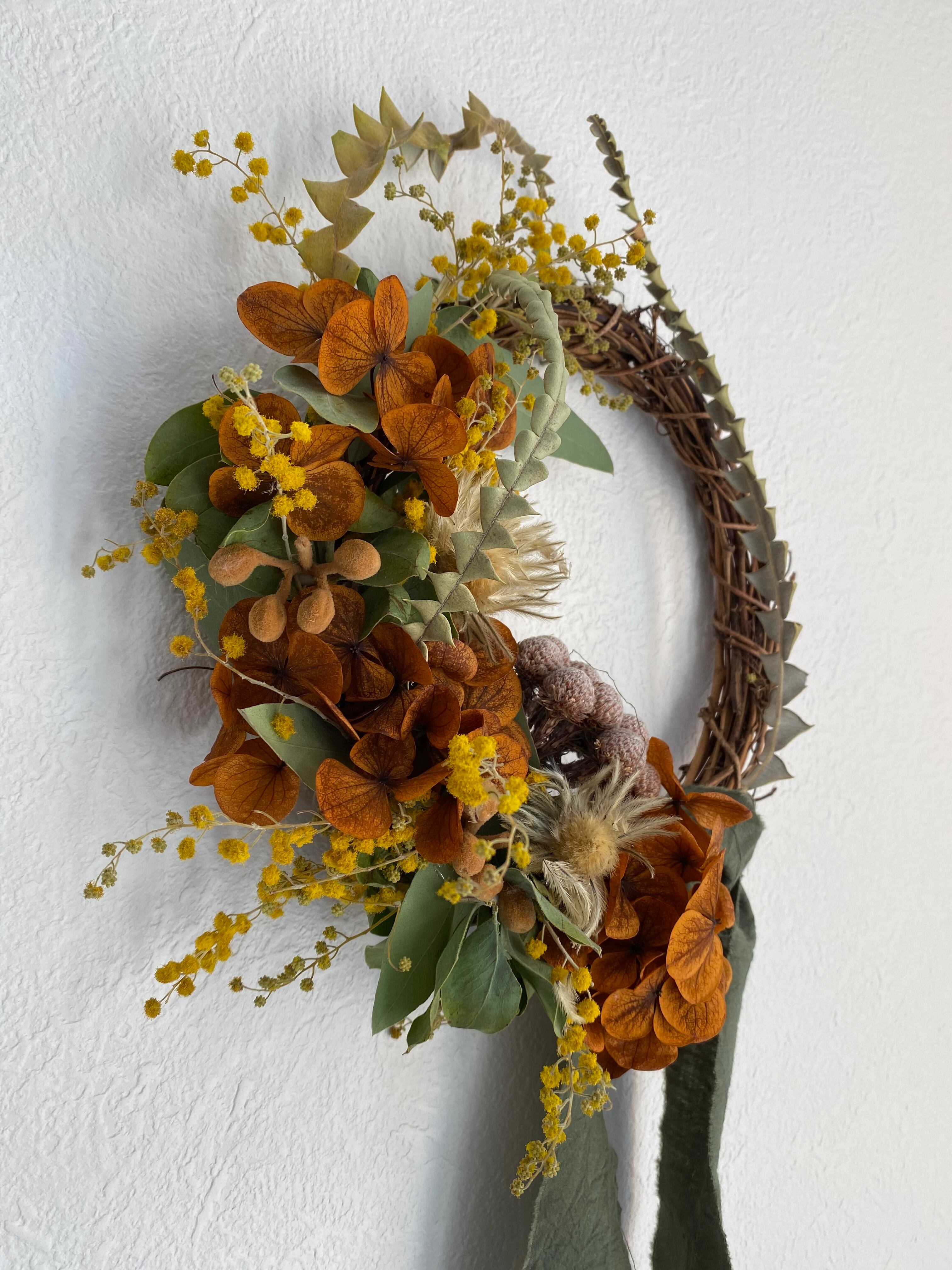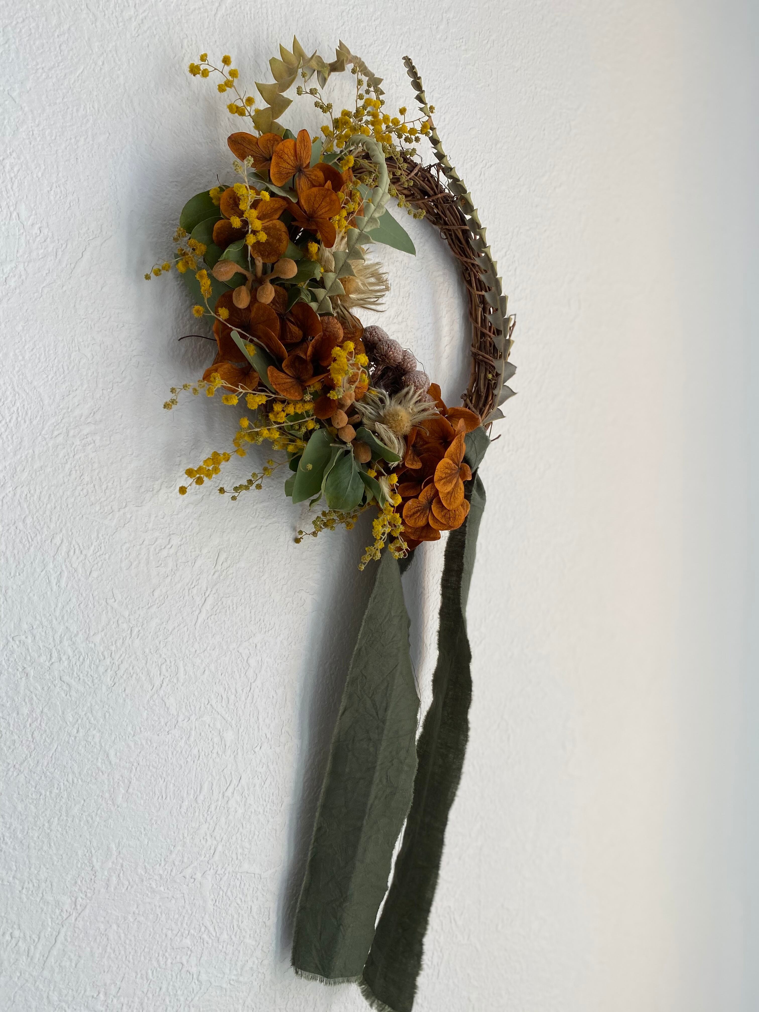ミモザとブラウン紫陽花のリース