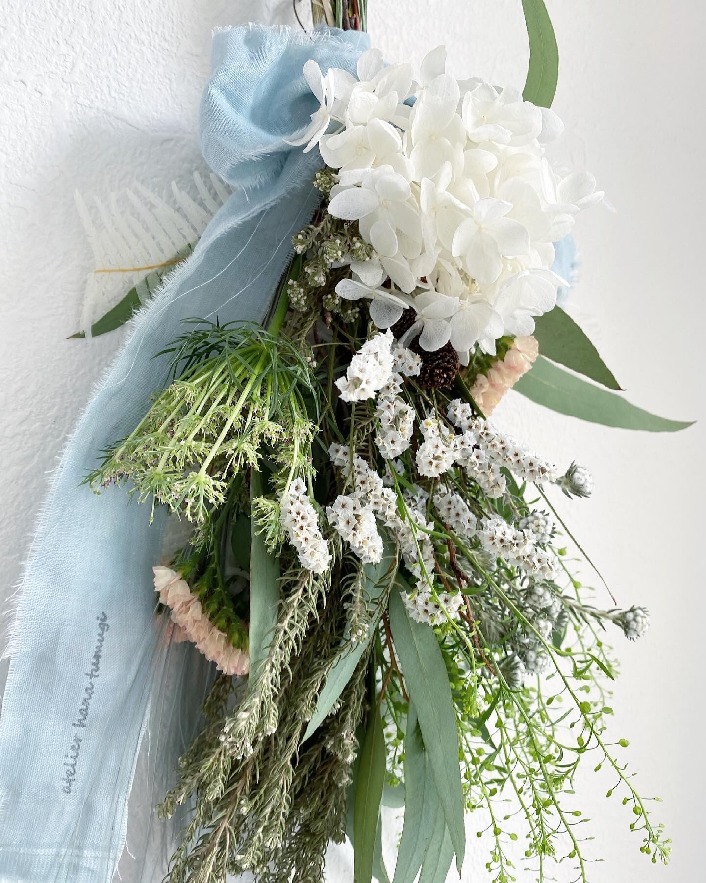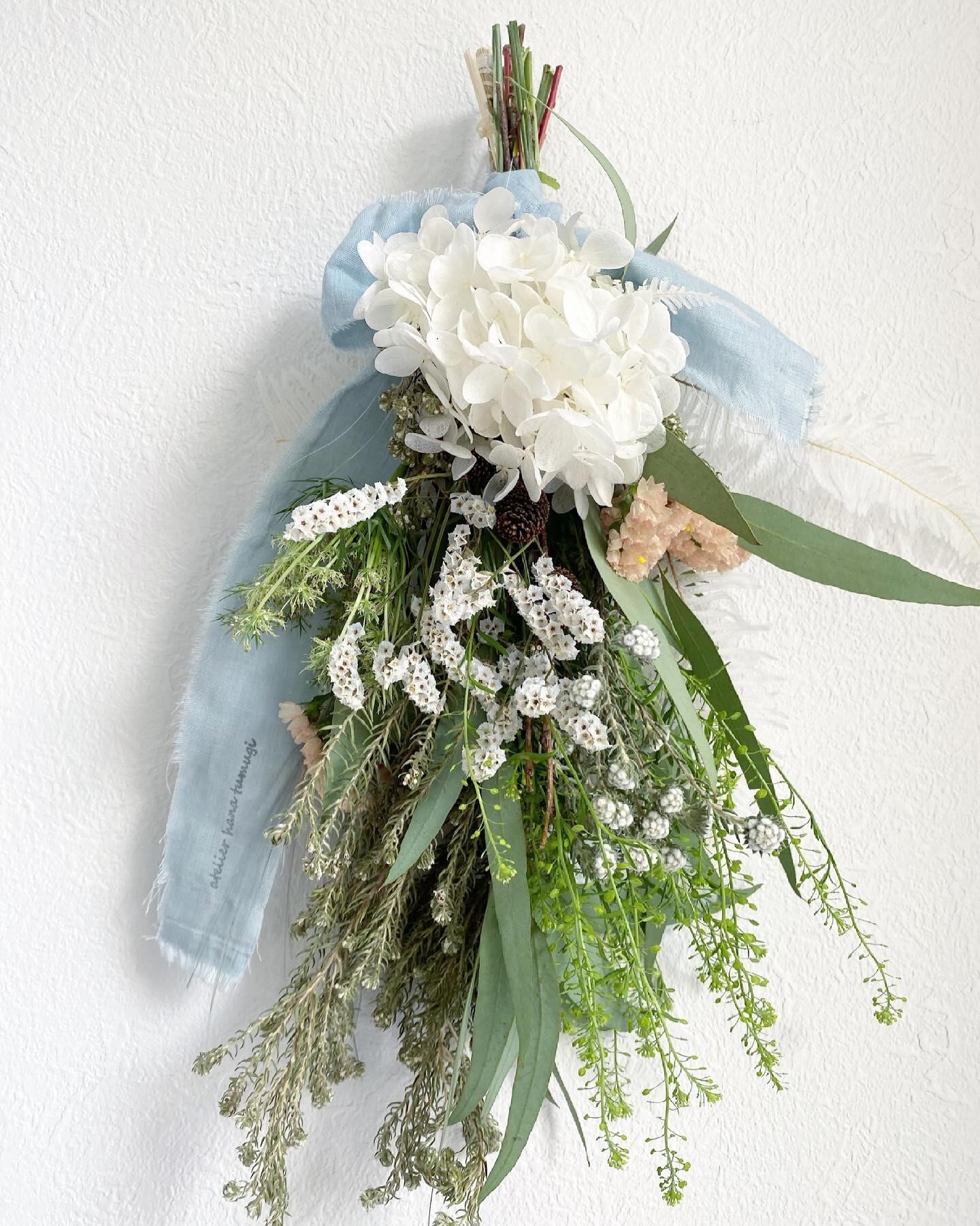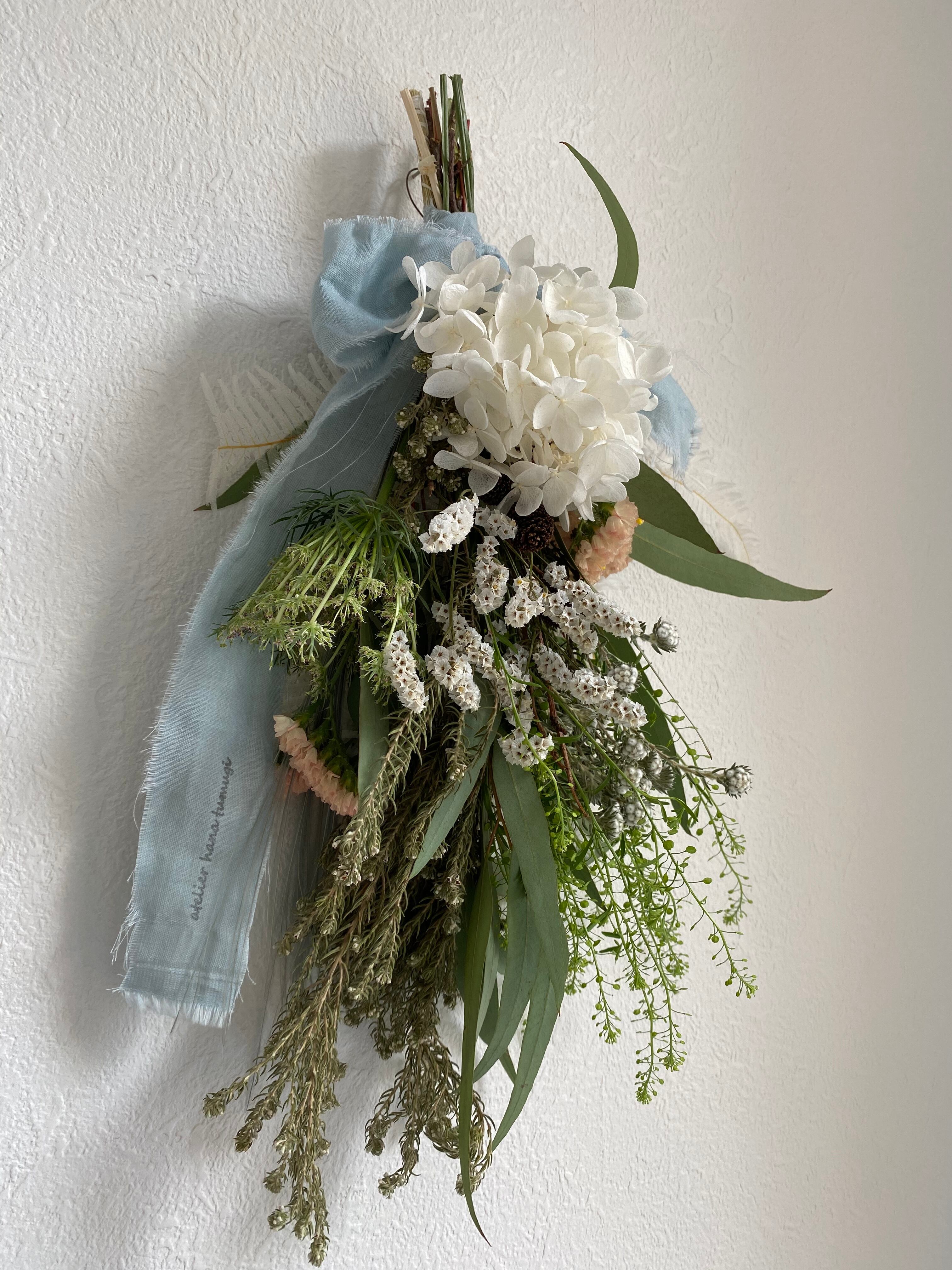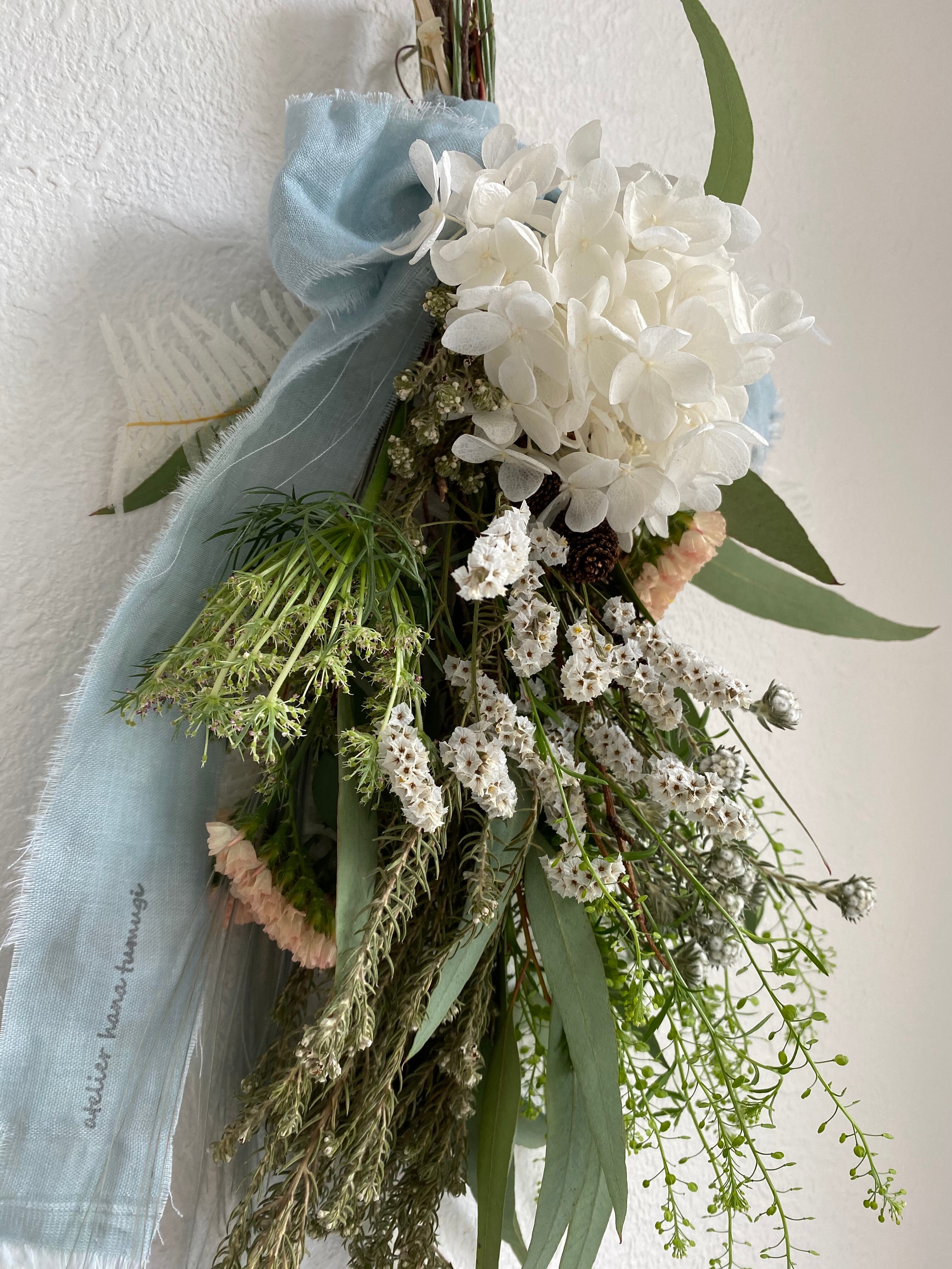 グリーンと、プリザーブドフラワーの紫陽花を使ったシンプルなスワッグです。